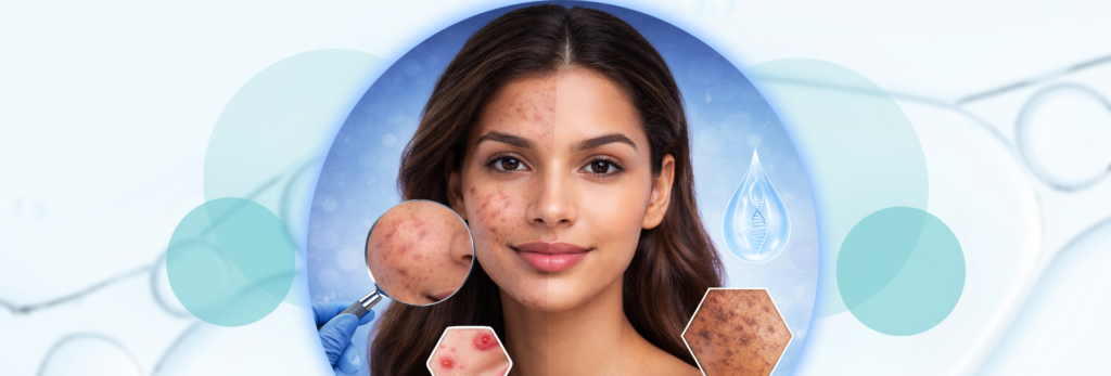 What happens: Acne occurs when oil, bacteria, and dead skin clog hair follicles — leading to pimples, blackheads, and cysts.