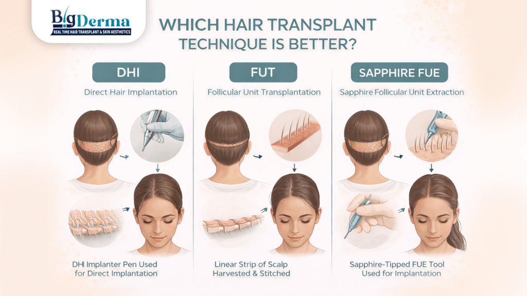 Today, many clinics prefer FUE and DHI as advanced hair transplant techniques because they are less invasive and provide natural-looking results. However, the best option always depends on the patient’s hair condition and the doctor’s recommendation after proper examination.