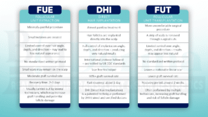 Hair transplant is a surgical procedure in which hair is moved from one part of the scalp to areas that are bald or thinning. It is also known as hair restoration or hair replacement. The three most common hair transplant methods are FUE, DHI, and FUT. While these techniques can deliver similar hair restoration results, each method has unique differences in procedure, recovery time,cost and benefits.